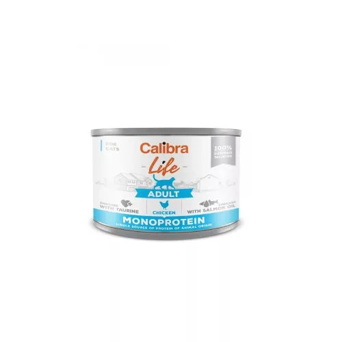 Calibra Cat Life Adult Chicken este o hrană umedă la conservă, cu pui, dezvoltată special pentru pisici adulte. Rețeta conține taurină esențială, deosebit de importantă pentru funcționarea corectă a vederii și pentru susținerea activității cardiace. Organismul pisicilor nu poate produce taurina în mod natural, de aceea este necesară suplimentarea acesteia prin alimentație.