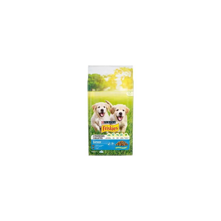 Hrană uscată pentru câini Friskies Junior cu pui, adaos de legume și lapte este o hrană uscată completă pentru căței.