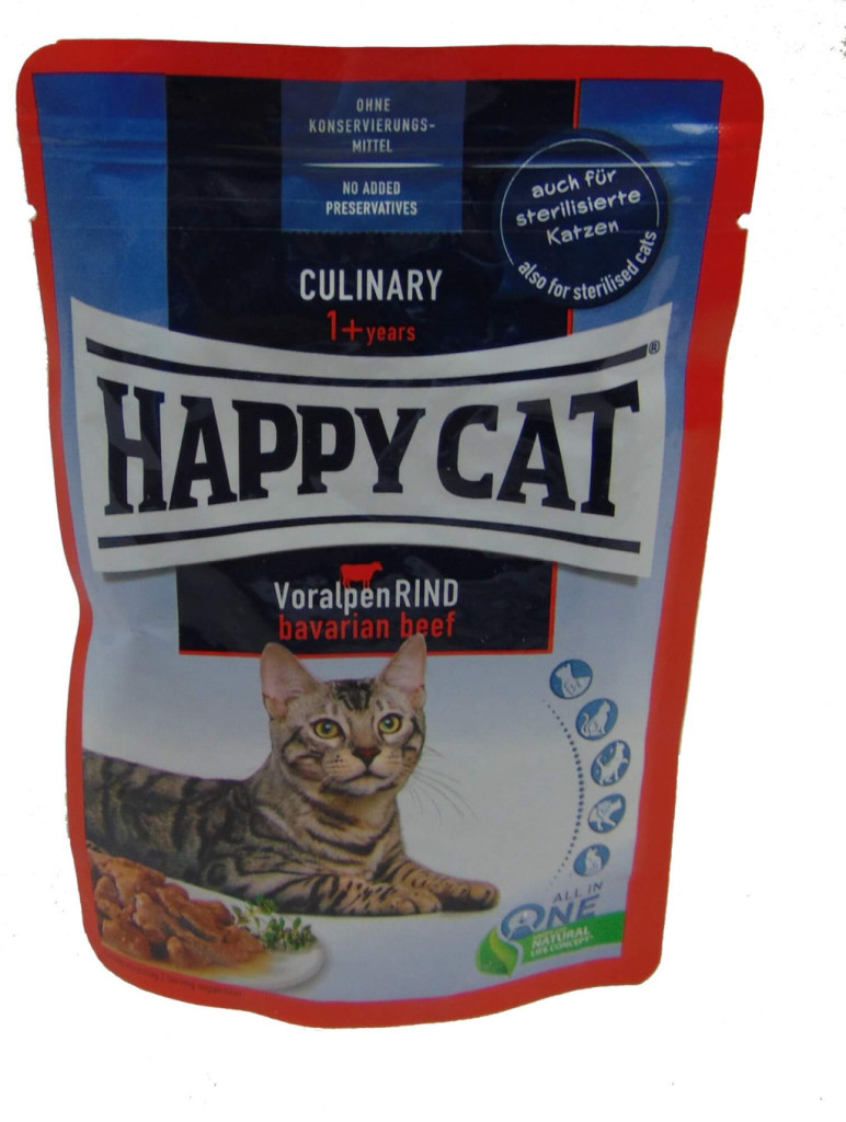 Happy Cat Pouch Sauce Culinary este o hrană umedă pentru pisici cu aromă de carne de vită.