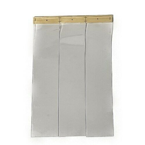 Perdea termică realizată din benzi transparente din PVC montate pe lamele din lemn natural pentru protecție împotriva vântului și a frigului la intrarea în căsuța pentru câini.